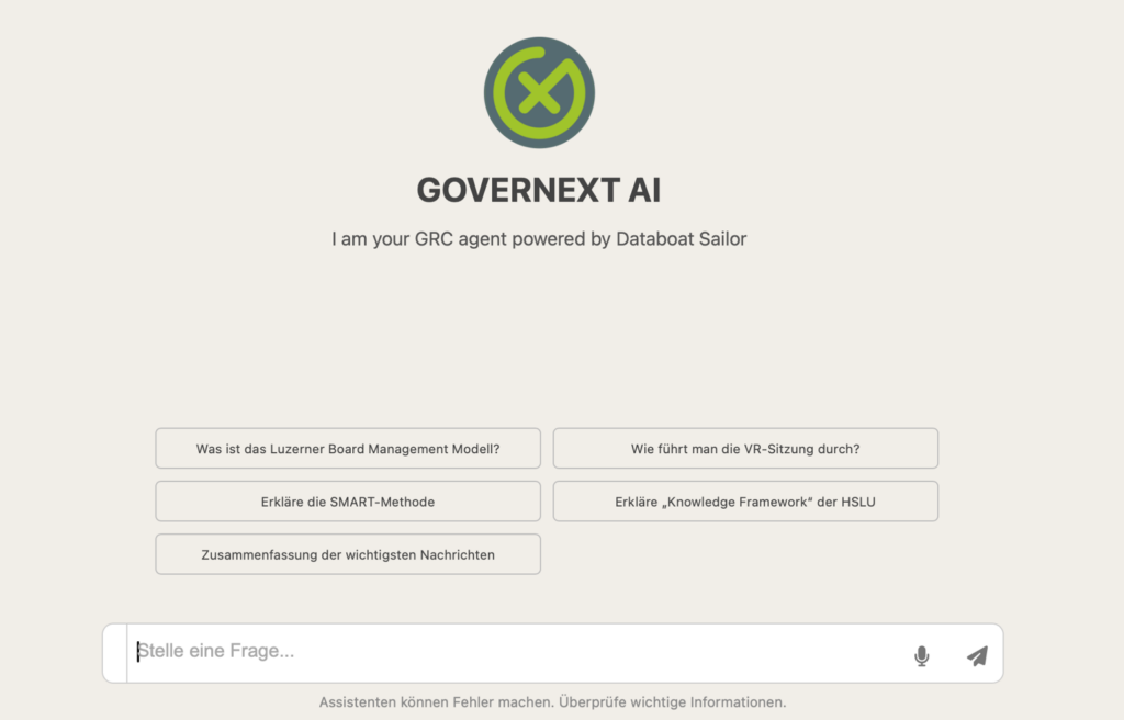 Das GRC-Führungsinstrument aus dem Luzerner Board Management Modell: rechtssichere Oberleitung, sichere LLM-Nutzung mit Ihren eigenen Daten und maximale Transparenz für wirksame Governance in der Schweiz.